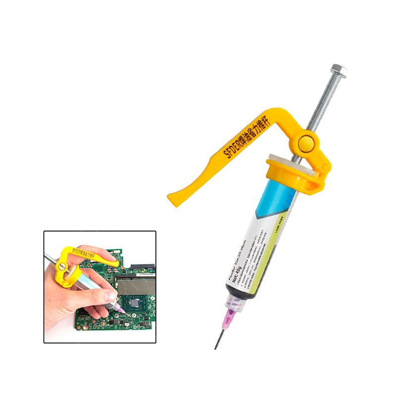 - Herramienta manual para dispensar flux o pasta de soldar desde jeringa con mayor precisión.
