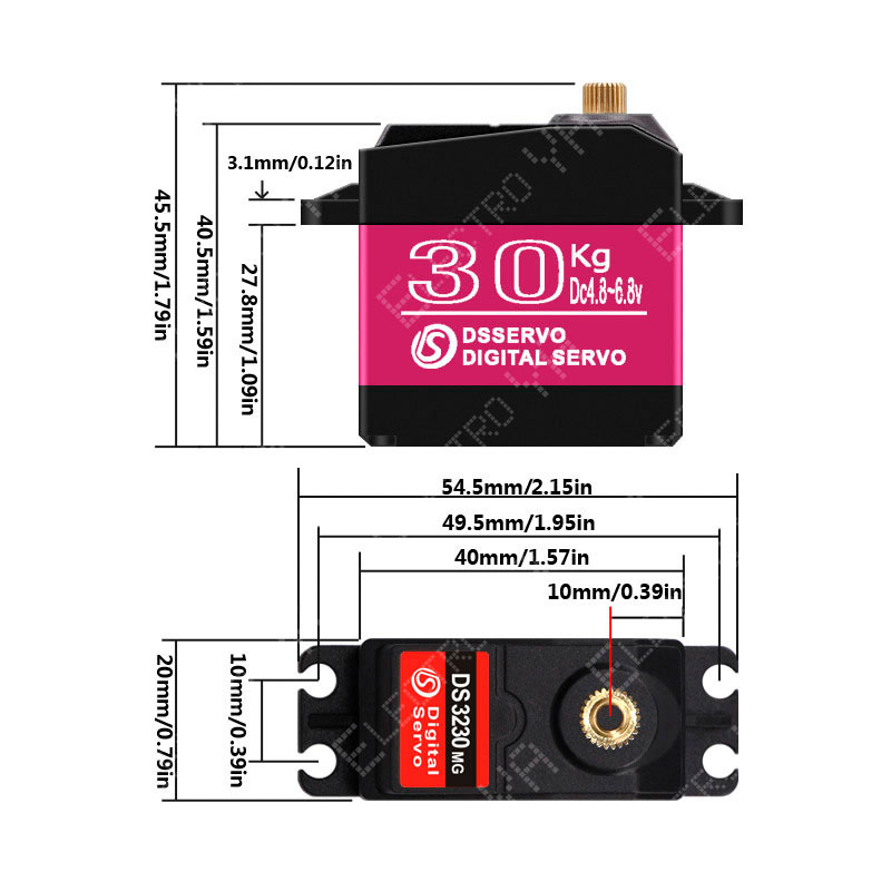 El DS3230 (DS3230MG) es un servo digital de alto par diseñado para robótica, vehículos RC, actuadores y mecanismos que requieren fuerza, precisión y buena resistencia mecánica. Integra engranajes metálicos, doble rodamiento, control PWM y protección IP66, con carcasa reforzada y un formato compacto de 40 x 20 x 40,5 mm.
